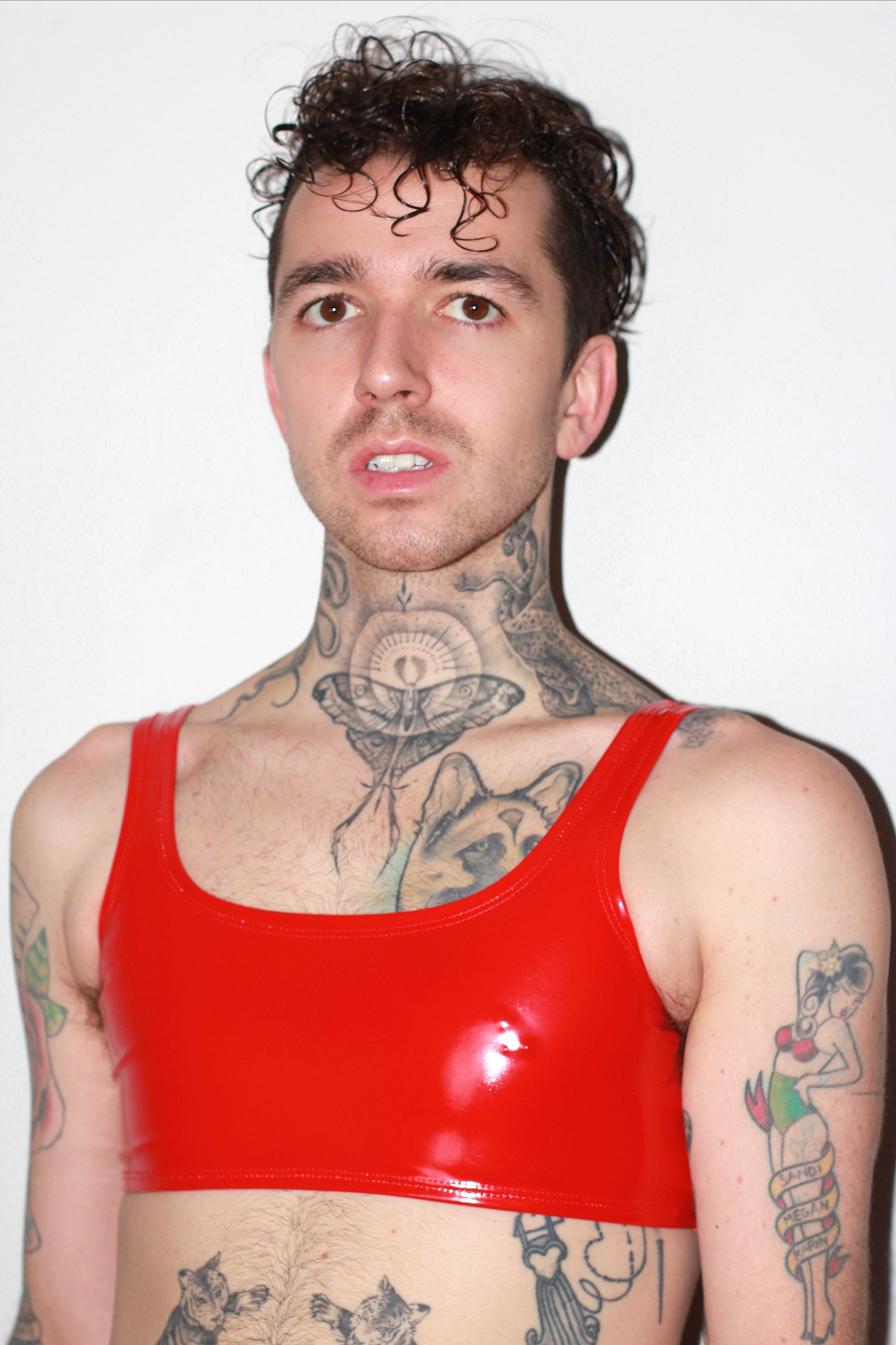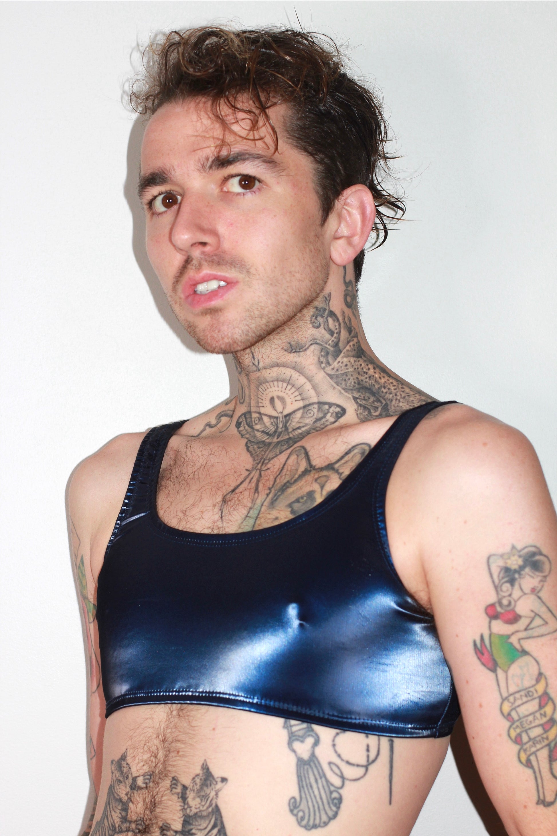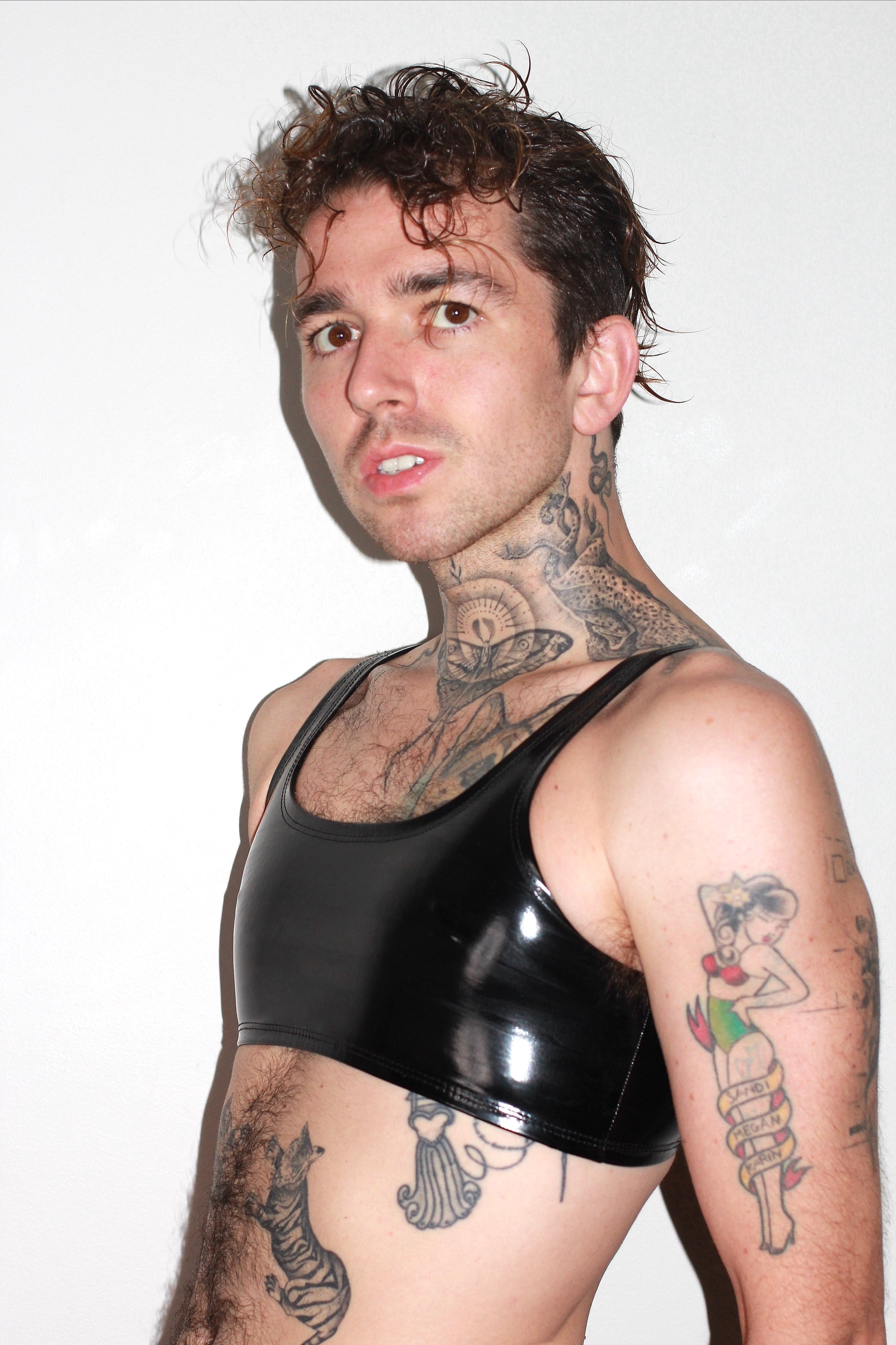 hiny PU coating on poly spandex Vinyl. Content: 90% Poly 10% Spandex