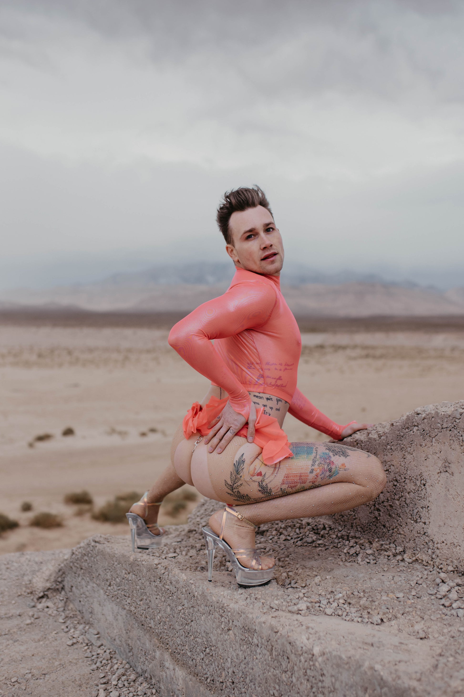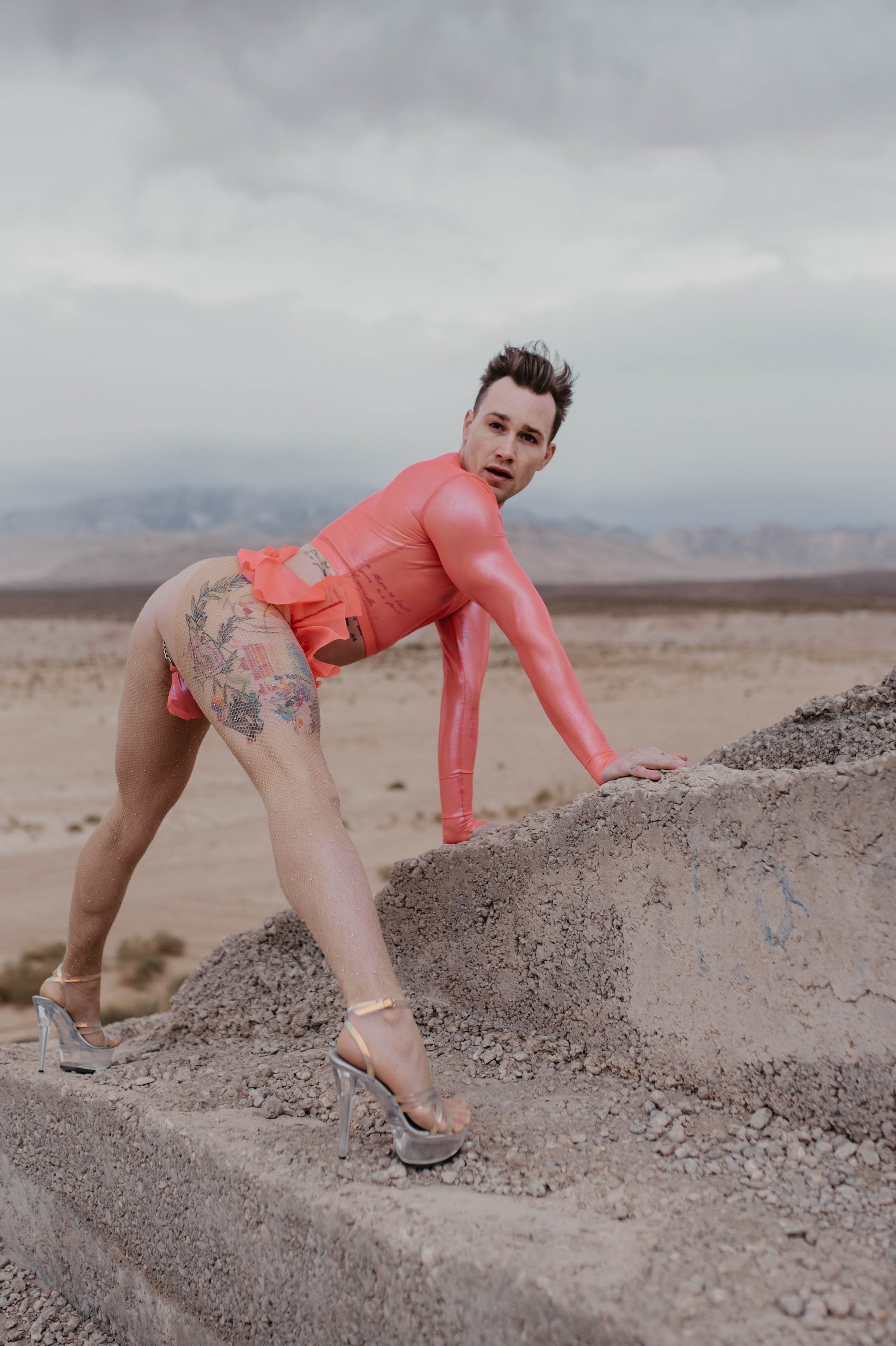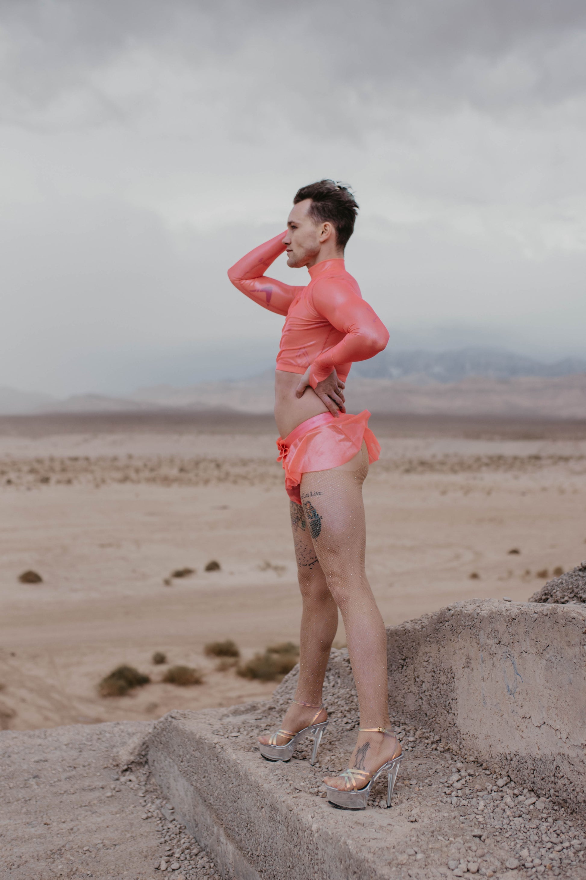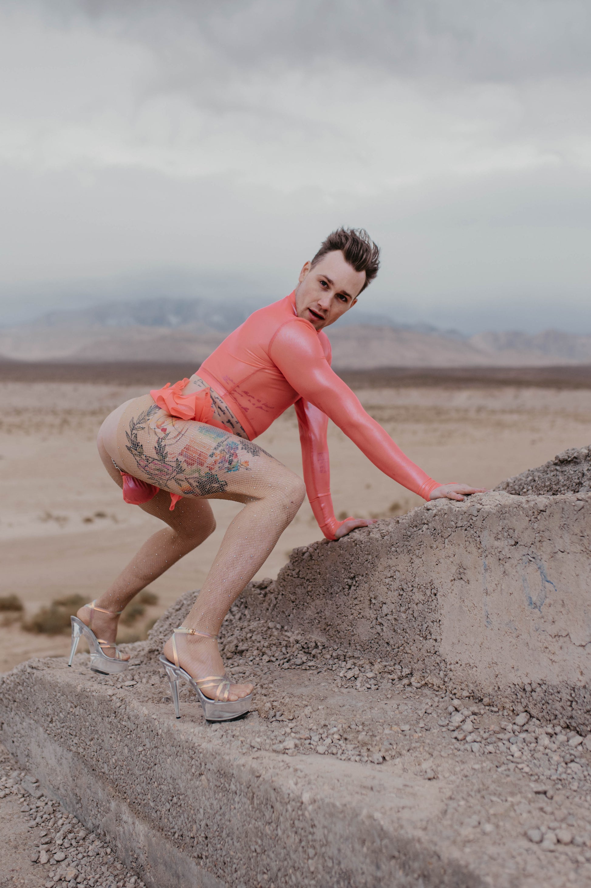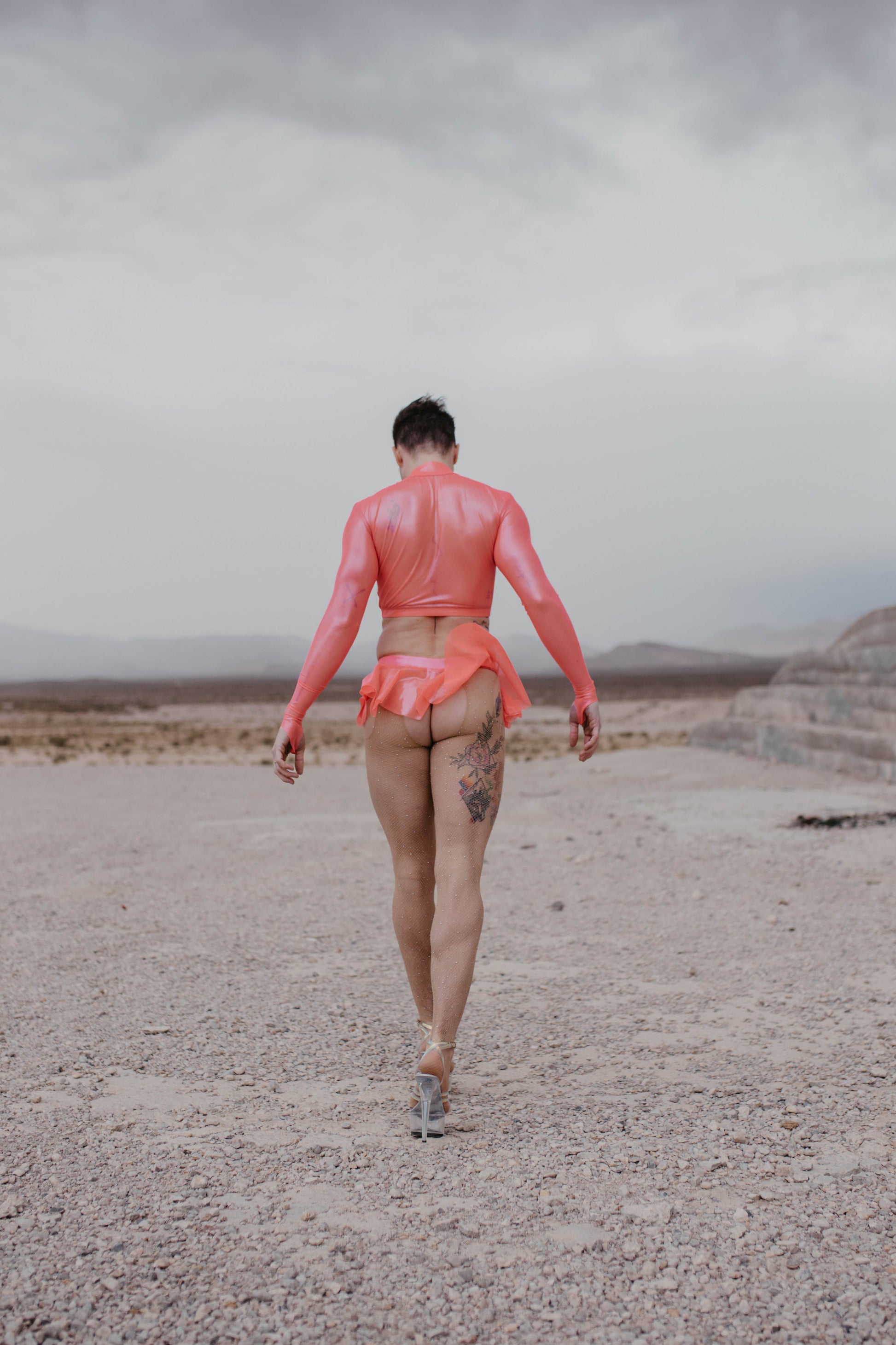 Pink coated mesh long sleeve crop. Four way stretch poly. spandex. 82% poly. 18% spandex.